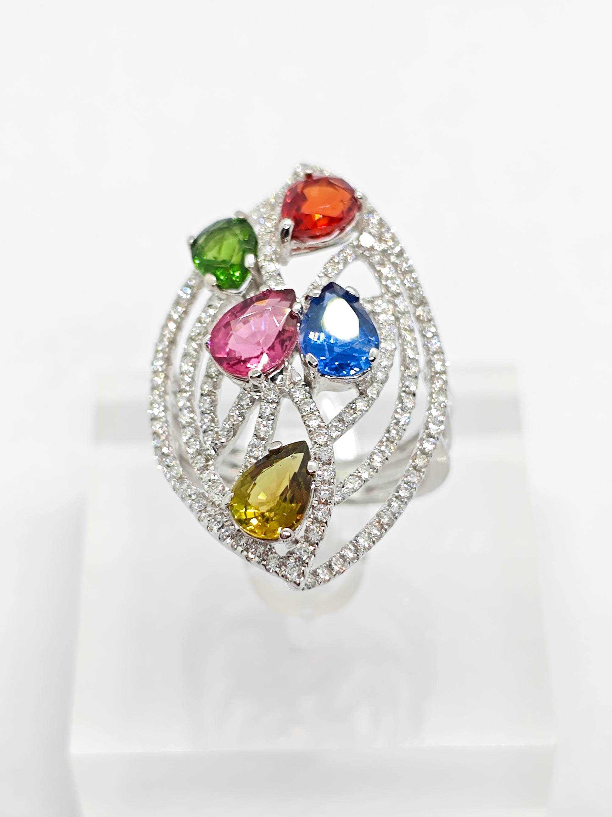 150 diamonds (0.91 carat), 5 fanci colour gem stones (4.1 carat)
