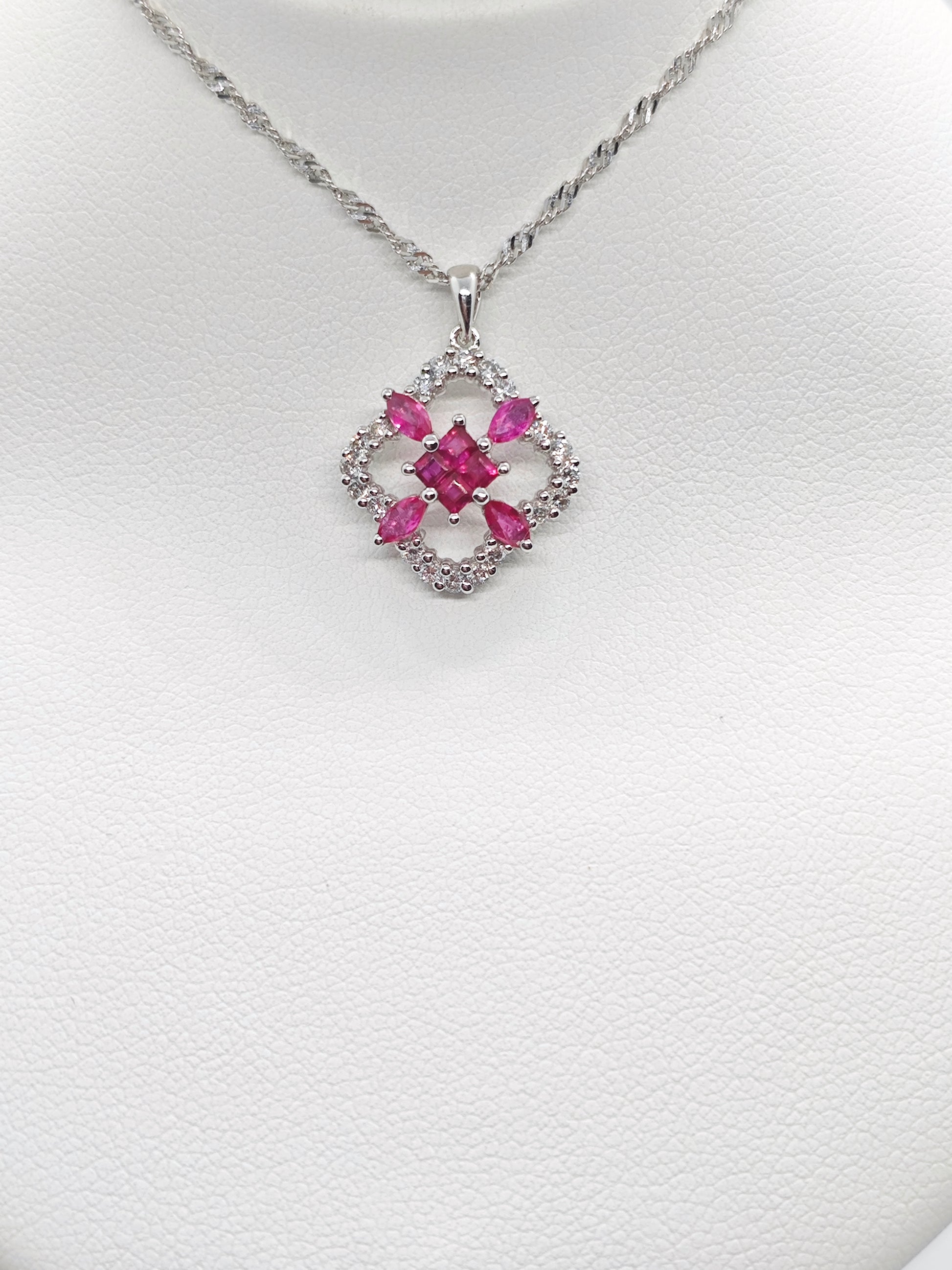 20 diamonds (0.26 carat), 4 princess ruby (0.25 carat), 4 marquis ruby (0.30 carat)