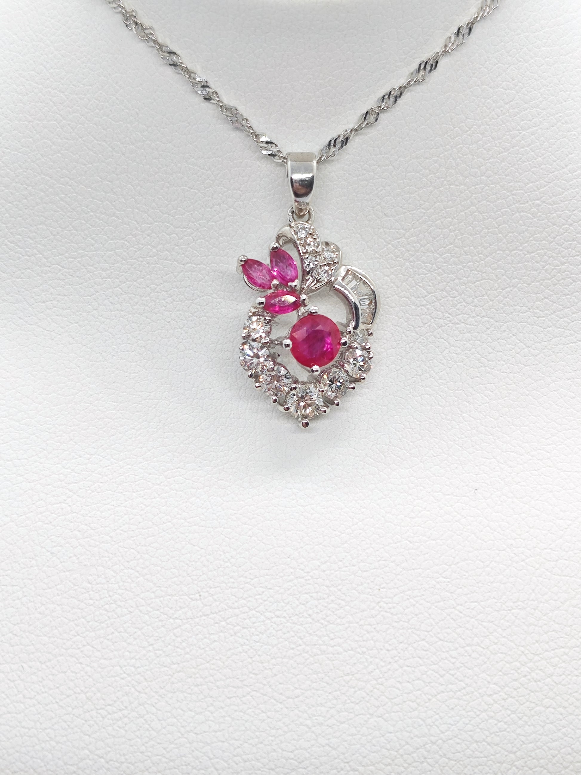 1 ruby (0.46 carat), 3 marquis ruby (0.26 carat), 12 diamonds (0.54 carat), 4 tapered diamonds (0.09 carat)