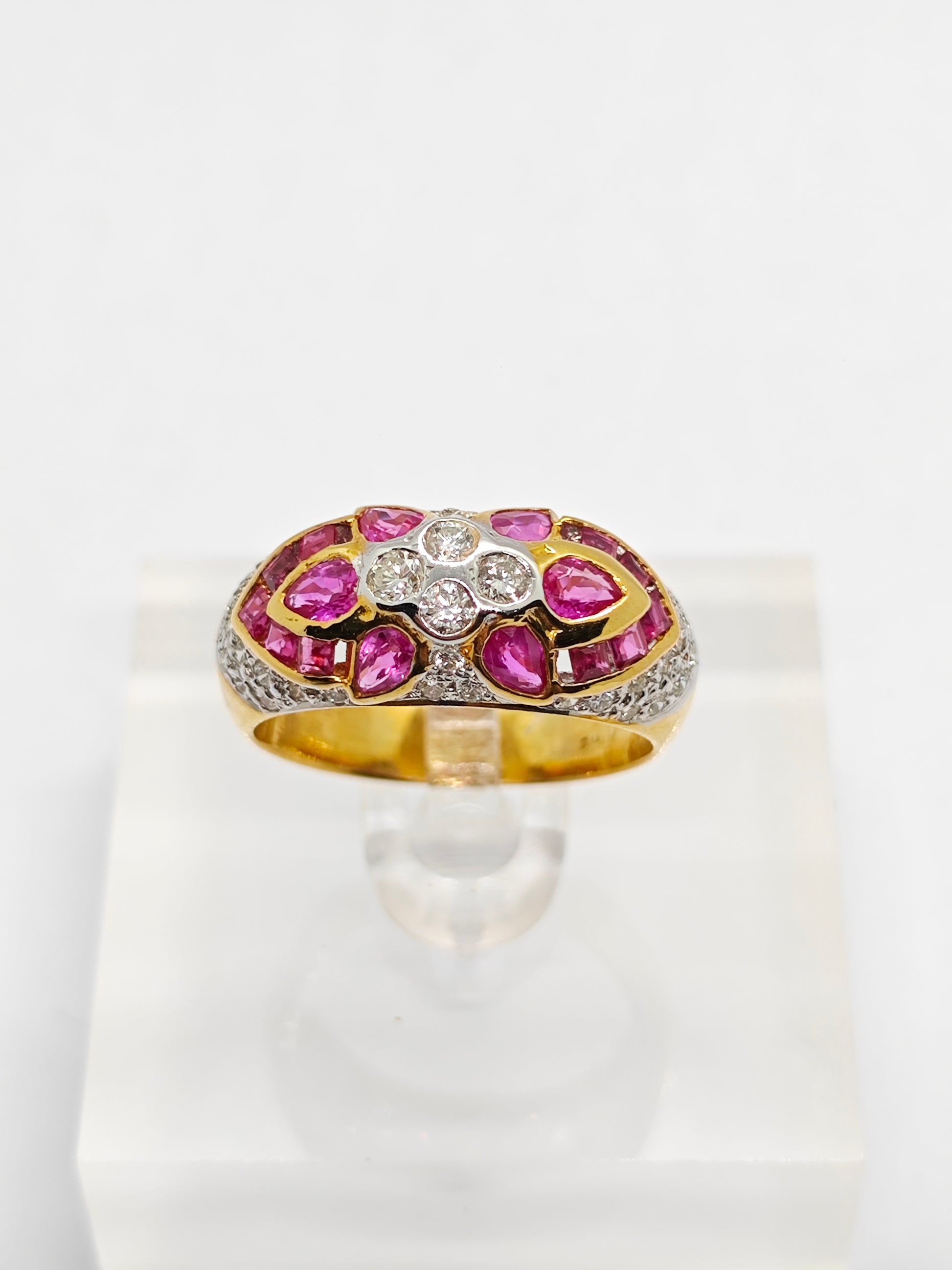 6 ruby (0.76 carat), 10 ruby (0.56 carat), 42 diamonds (0.5 carat)