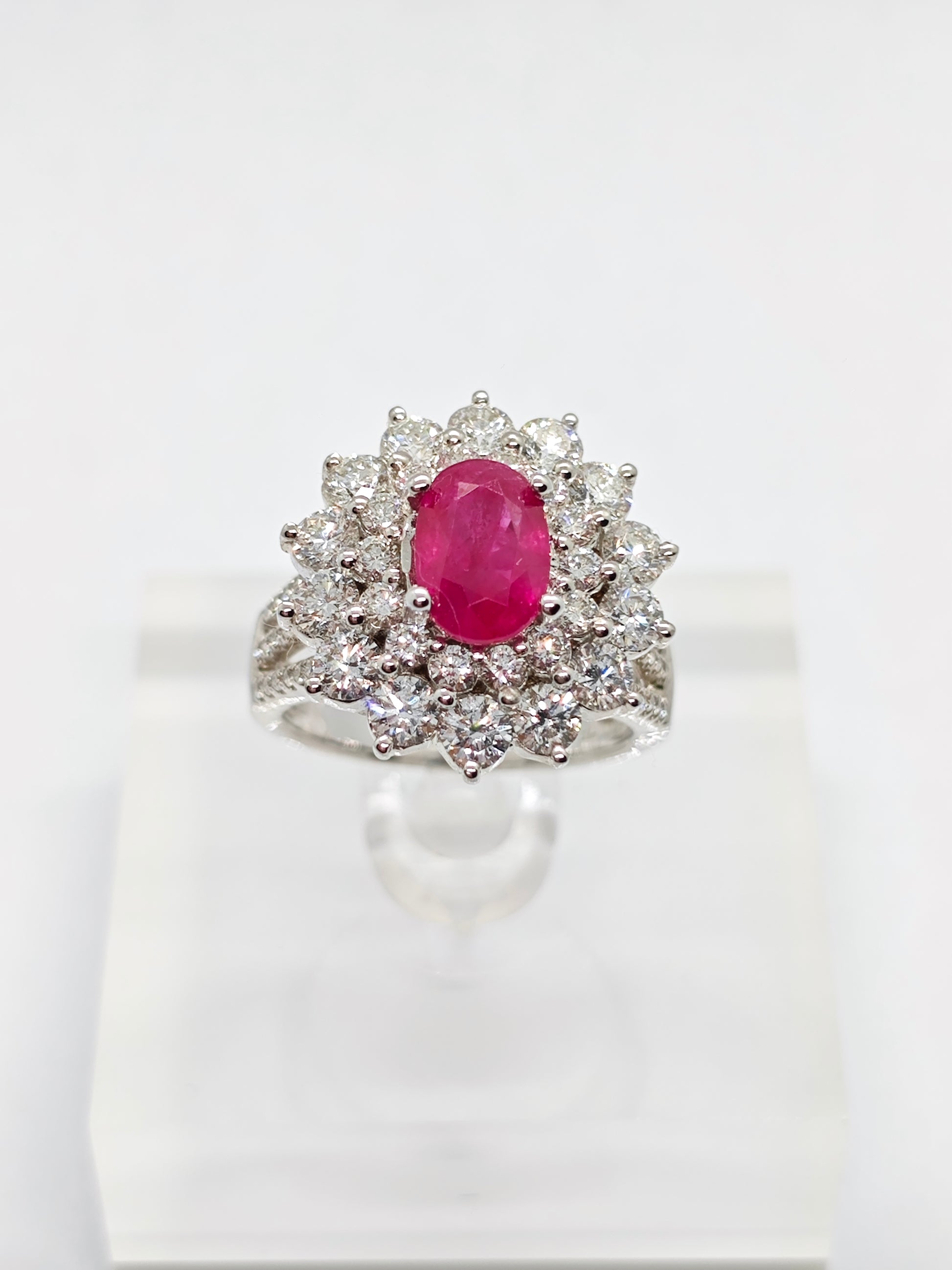 1 ruby (1.44 carat), 14 diamonds (1.24 carat), 14 diamonds (0.38 carat), 48 smaller diamonds (0.18 carat)