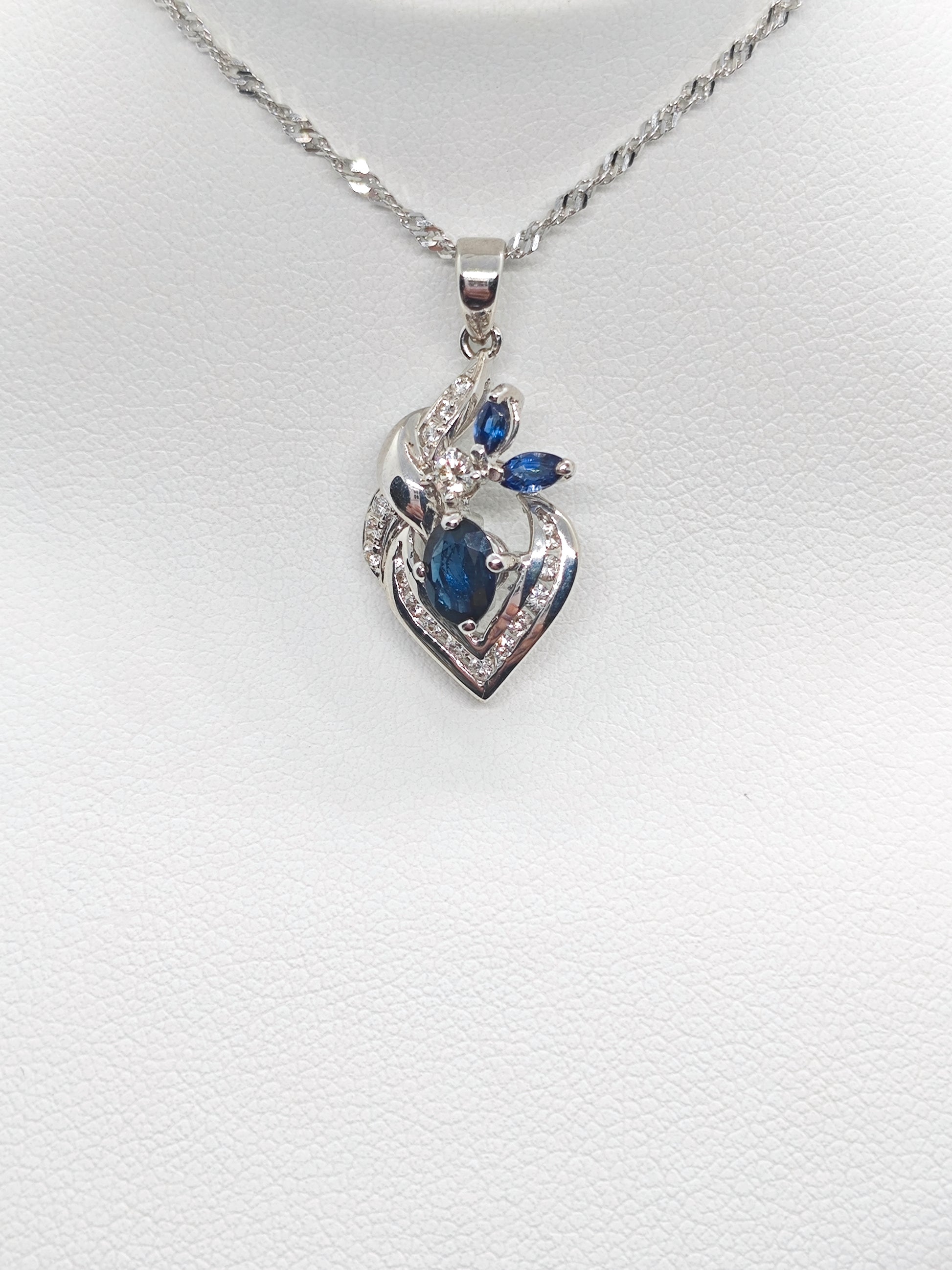 1 sapphire (0.41 carat), 2 marquis sapphire (0.2 carat), 17 diamonds (0.21 carat)