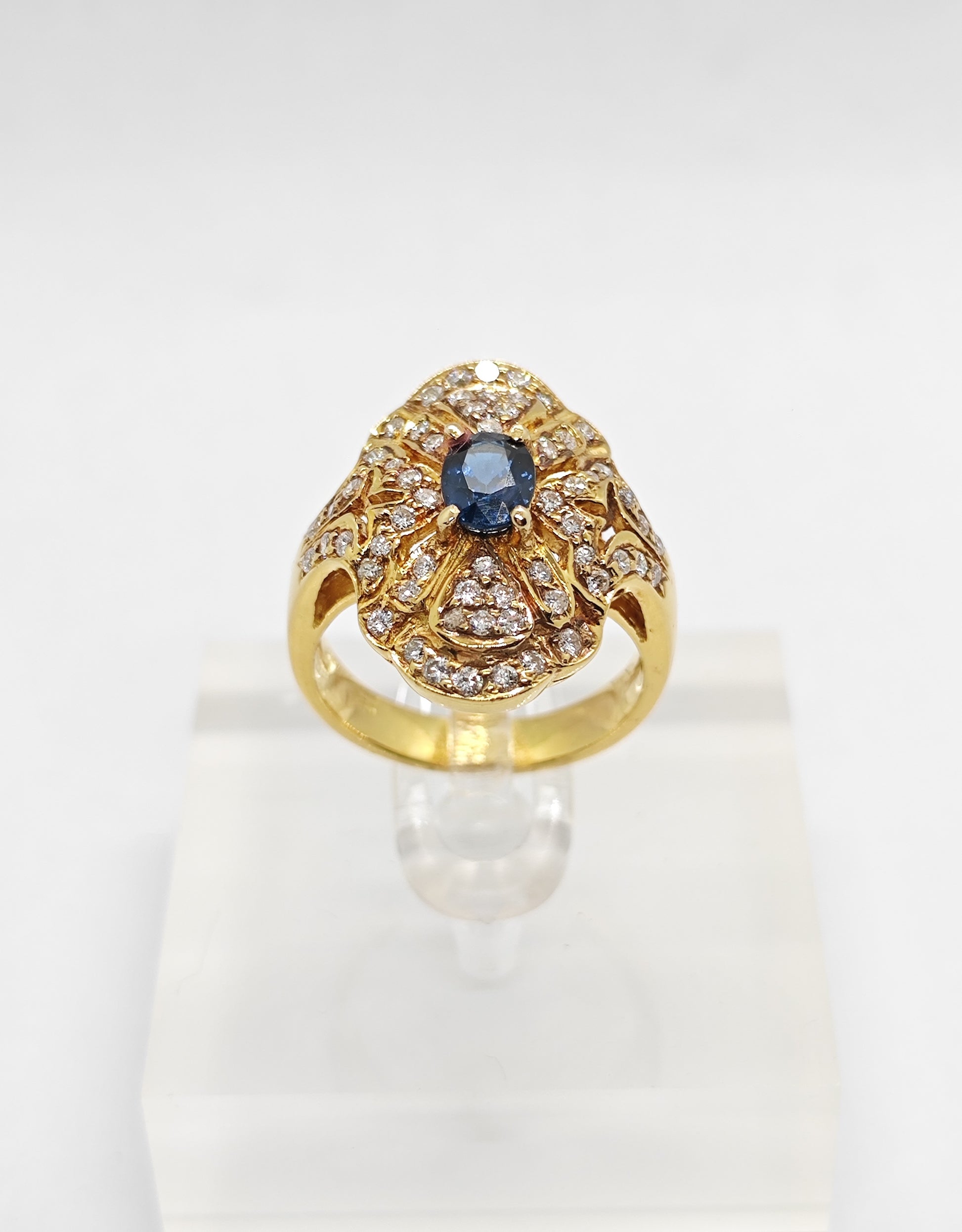 1 sapphire (0.72 carat), 60 diamonds (0.54 carat)