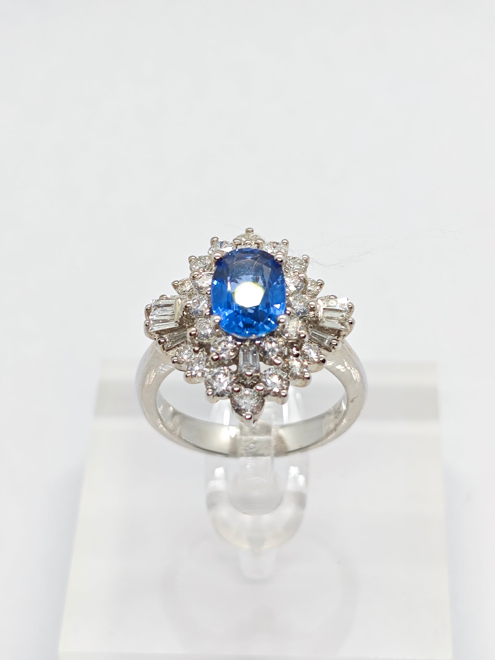 1 sapphire (1.72 carat), 24 diamonds (0.89 carat), 10 tapered diamonds (0.29 carat)